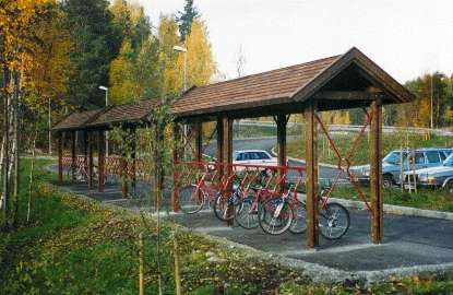 Trä-miljö serien har väderskydd, terminaler, informationstavlor och cykeltak med samma design.