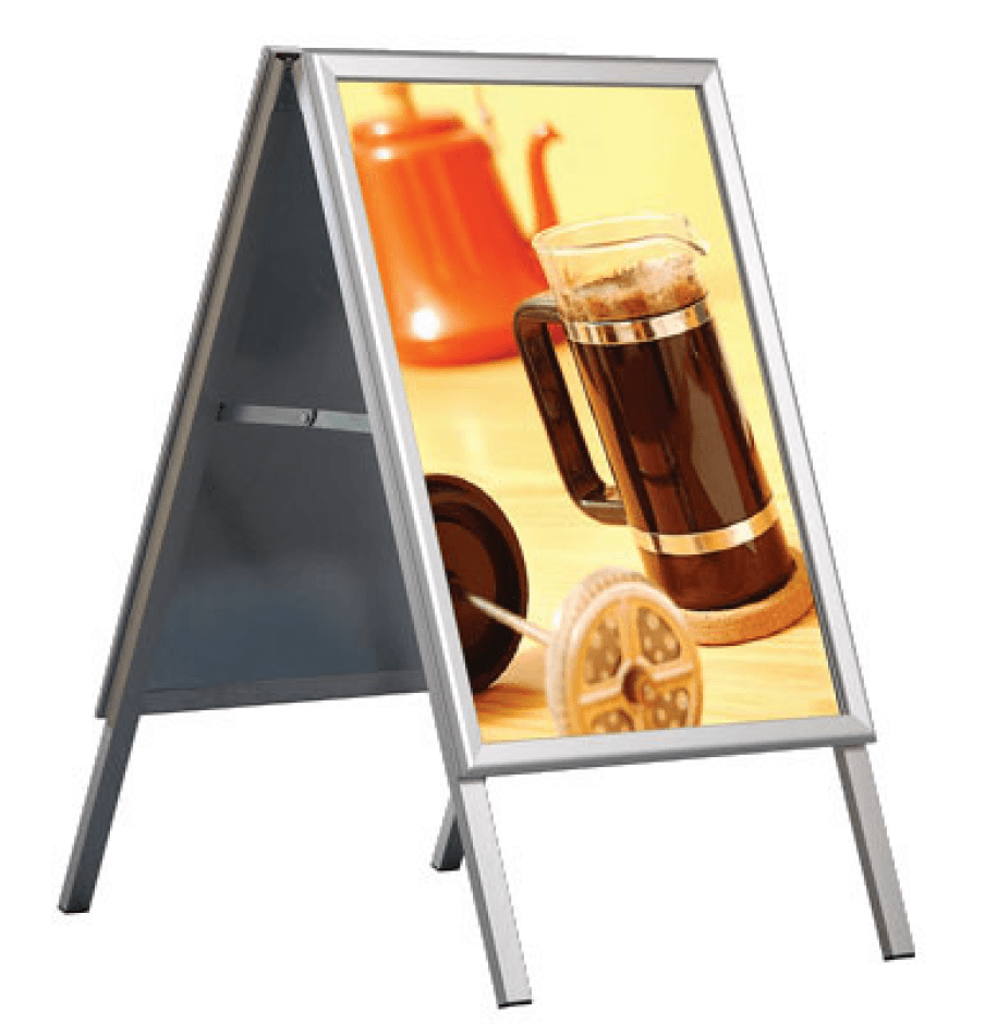 SnapStand är en funktionell gatupratare (A-ställ) tillverkad av underhållsfria aluminiumprofiler för inom och utomhusbruk. Affischen hålls enkelt på plats med de fyra öppningsbara ramprofilerna och skyddas av en 0,5 mm frontplast.